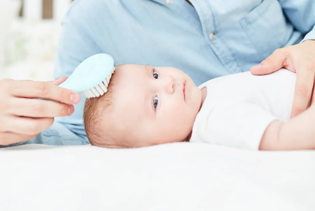 Although cradle cap can be removed by brushing, it’s a bit trickier than just running a comb or brush over their heads. This cradle cap care is best done during bath time when baby’s head is already wet with baby shampoo rubbed in their hair. First, loosen the dry skin by gently rubbing it with a wet washcloth. Then, you’ll want to go over the affected areas with a small, soft-bristled brush or a fine-toothed comb. You may need to apply some light pressure as you run the comb or brush over your little one’s cradle cap — just be mindful of the soft spots on baby’s head. Try brushing in different directions to better loosen the pieces of dry skin.